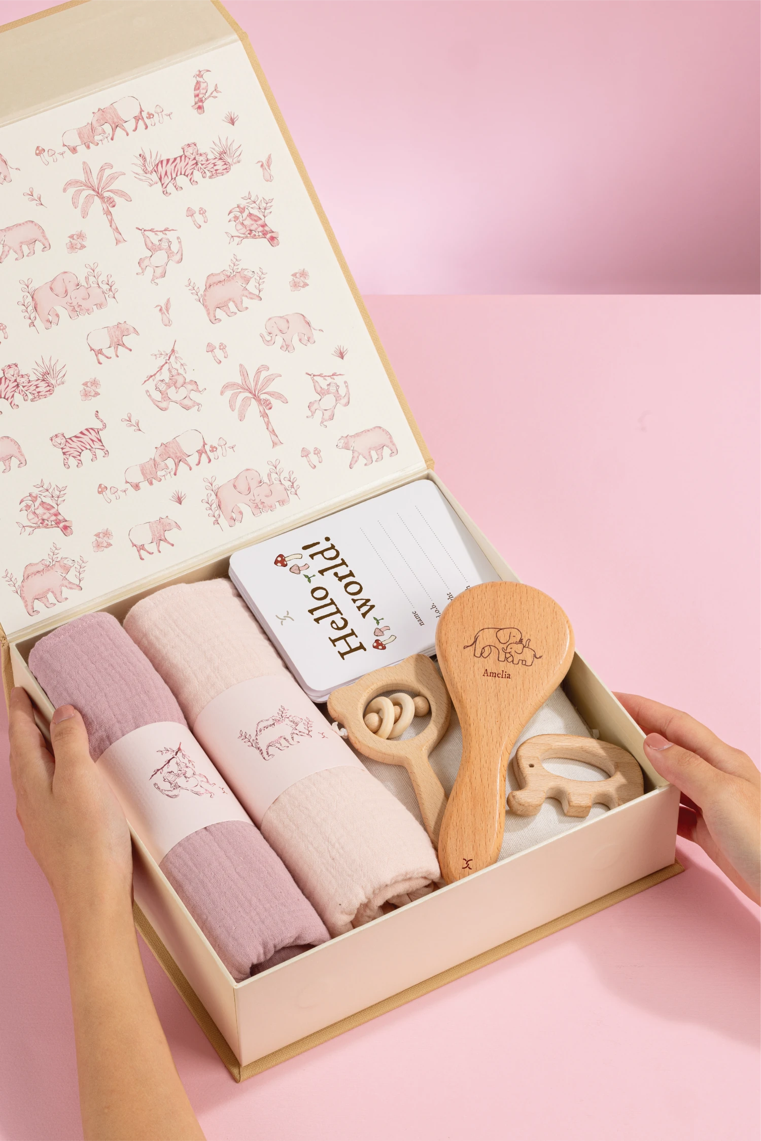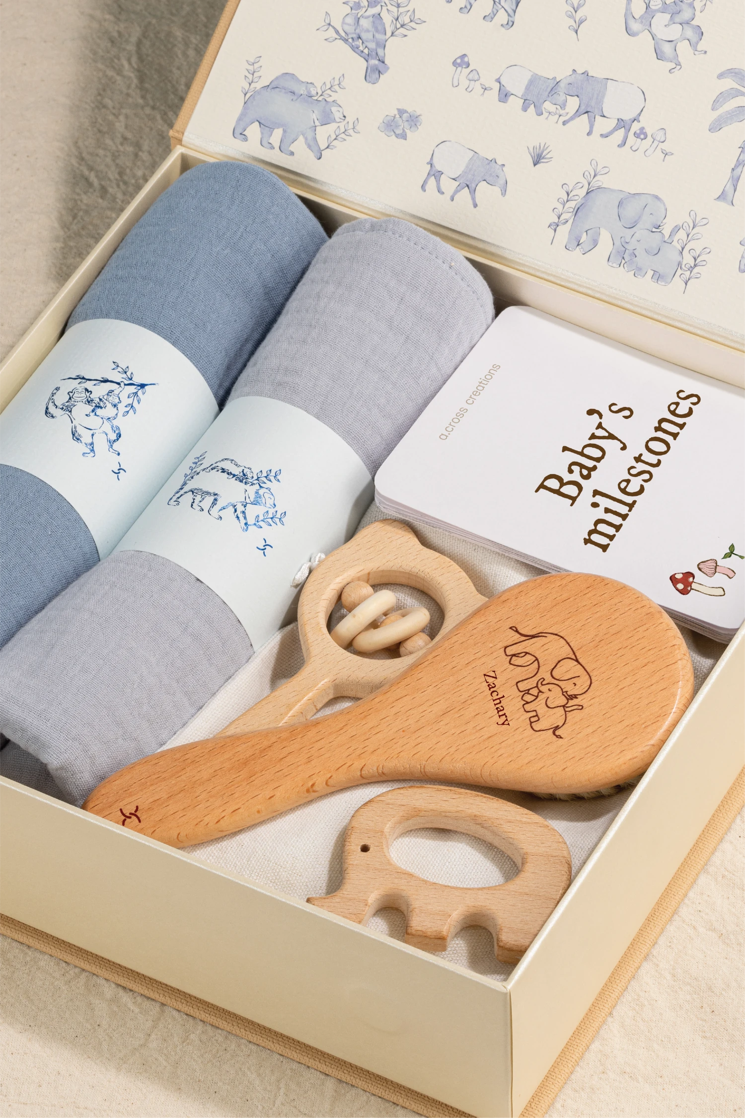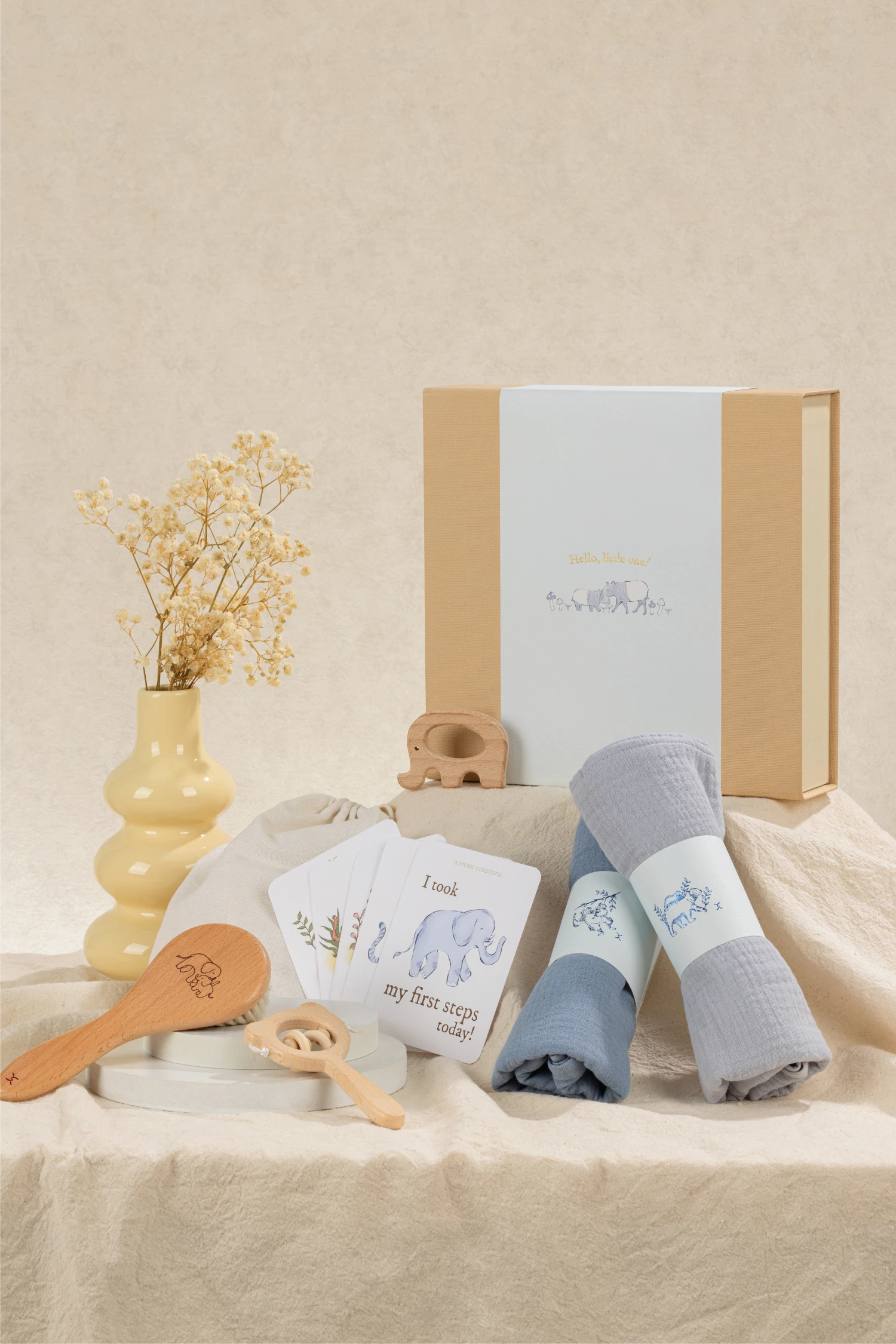 As babies begin their journey in this world, this carefully curated gift set includes milestone cards and flash cards for fun moments of learning and growing together. It also comes with natural wooden toys and soft cotton swaddles for peaceful rest and comfortable sleep.