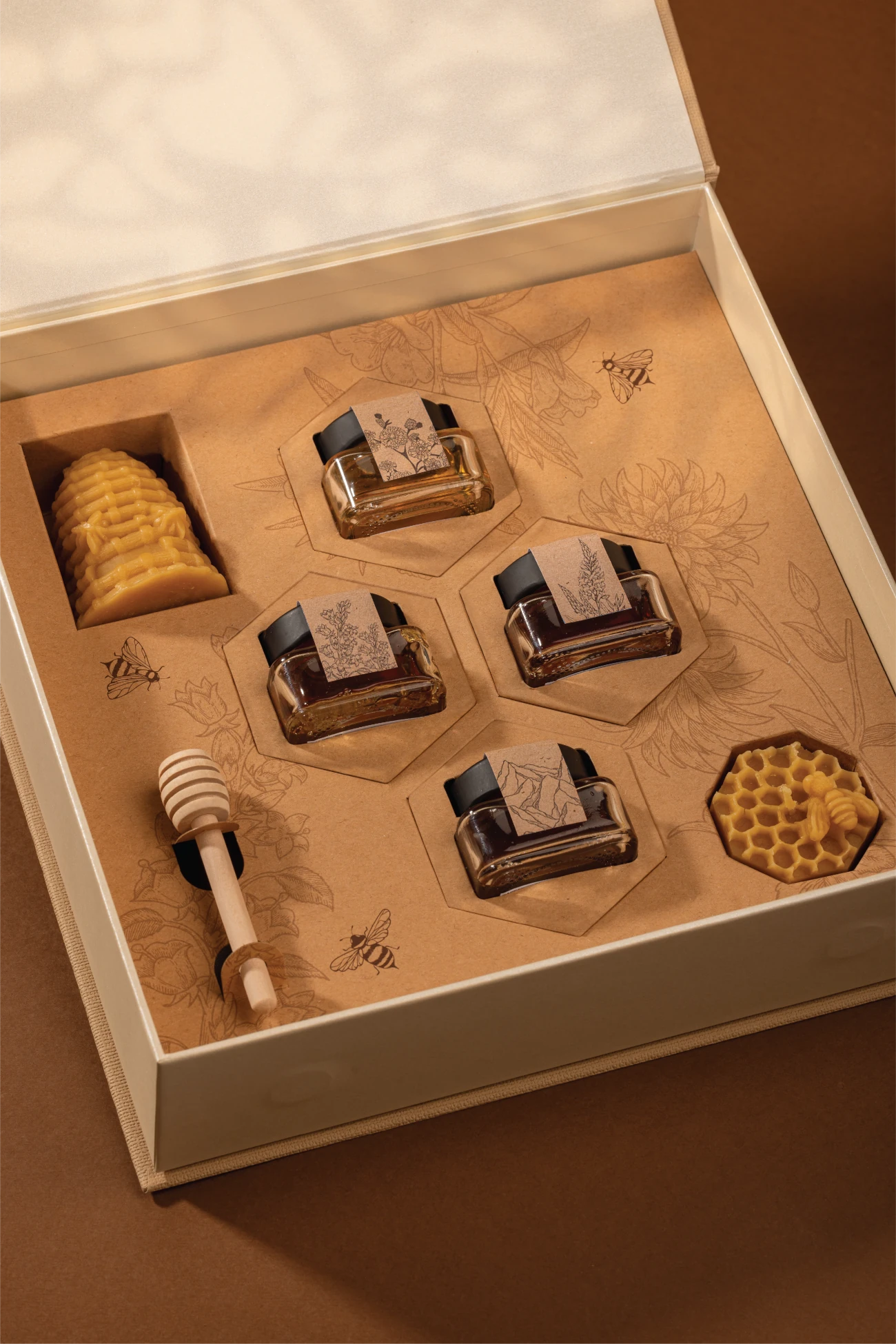 A delight that will be enjoyed by those who love self-care and wellness, this gift set features a collection of four pure honey varieties and two hand-poured beeswax candles- in the shape of a honeycomb and hive! Explore the endless recipes to make with these honeys or use them in your daily rituals, burning beeswax candles alongside them to purify the air.