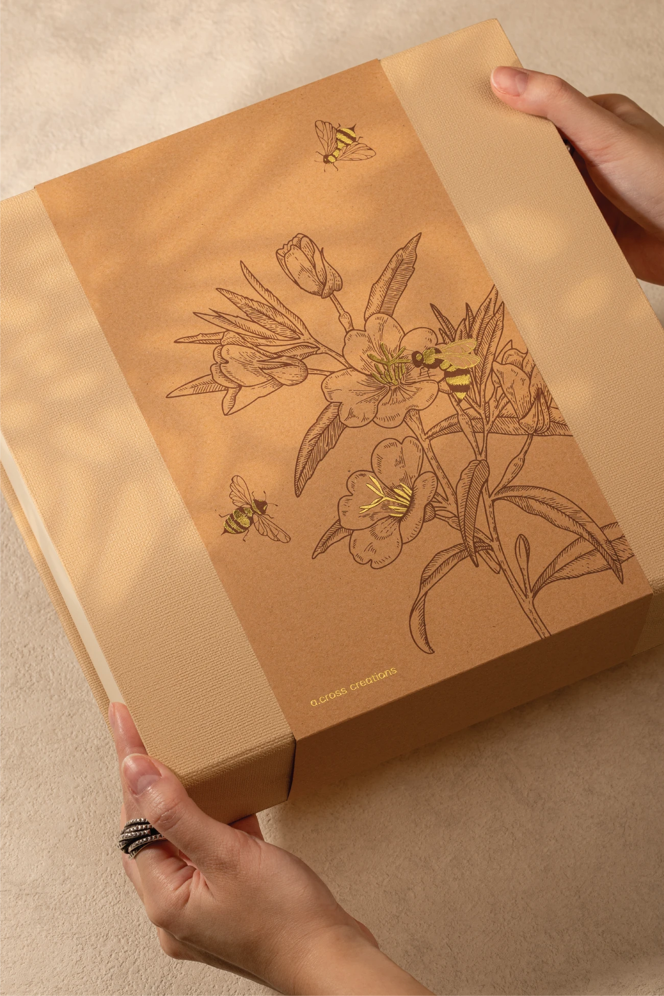 Adorned with intricate floral motifs, honeycomb details and glistening little golden bees; it is crafted with linen-textured and kraft paper, using only low-energy processes and materials.